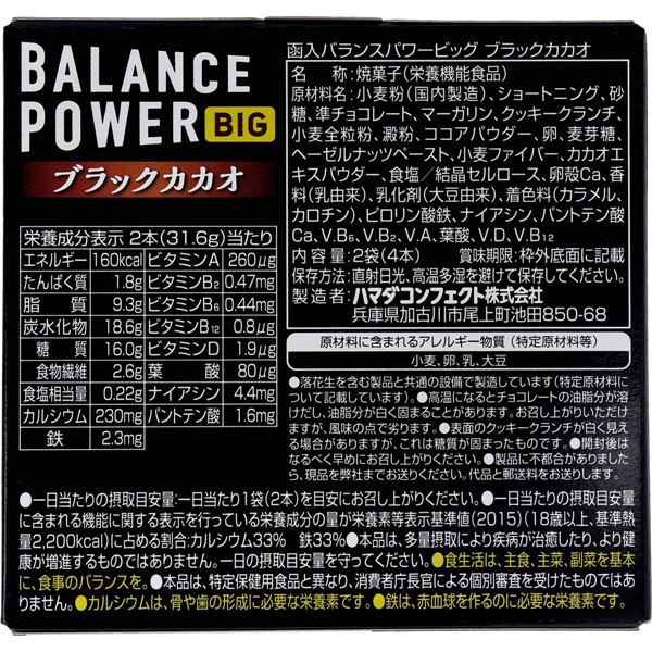 【品名・名称】焼菓子(栄養機能食品)【バランスパワービッグ ブラックカカオの原材料】小麦粉、ショートニング、砂糖、準チョコレート、マーガリン、クッキークランチ、小麦全粒粉、澱粉、ココアパウダー、卵、麦芽糖、ヘーゼルナッツペースト、小麦ファイバー、カカオエキスパウダー、食塩/結晶セルロース、卵殻Ca、香料(乳由来)、乳化剤(大豆由来)、着色料(カラメル、カロチン)、ピロリン酸鉄、ナイアシン、パントテン酸Ca、V.B1、V.B2、V.B6、V.A、葉酸、V.B12【栄養成分】2本(31.6g)当たりエネルギー:160kcaL、たんぱく質:1.8g、脂質:9.3g、炭水化物:18.6g、(糖質:16.0g、食物繊維:2.6g)、食塩相当量:0.22g、カルシウム:230mg、鉄:2.3mg、ビタミンA:260μg、ビタミンB1:0.4mg、ビタミンB2:0.47mg、ビタミンB6:0.44mg、ビタミンB12:0.8μg、葉酸:80μg、ナイアシン:4.4mg、パントテン酸:1.6mg【アレルギー物質】卵、乳、小麦、大豆【保存方法】直射日光、高温多湿を避けて保存してください。