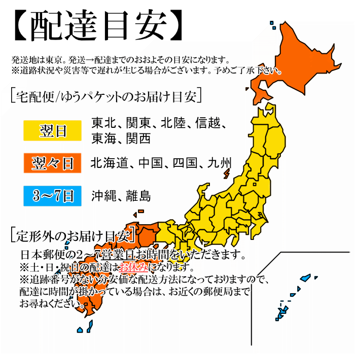また、「発送目安:約3-5営業日」とご案内しておりますが、こちらより遅れることがございます。